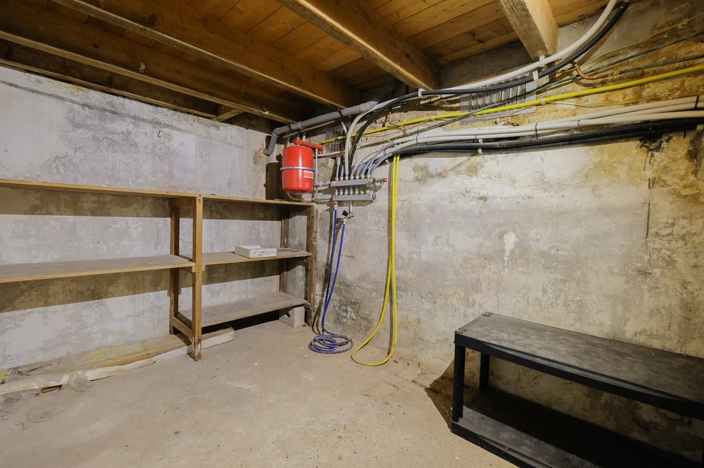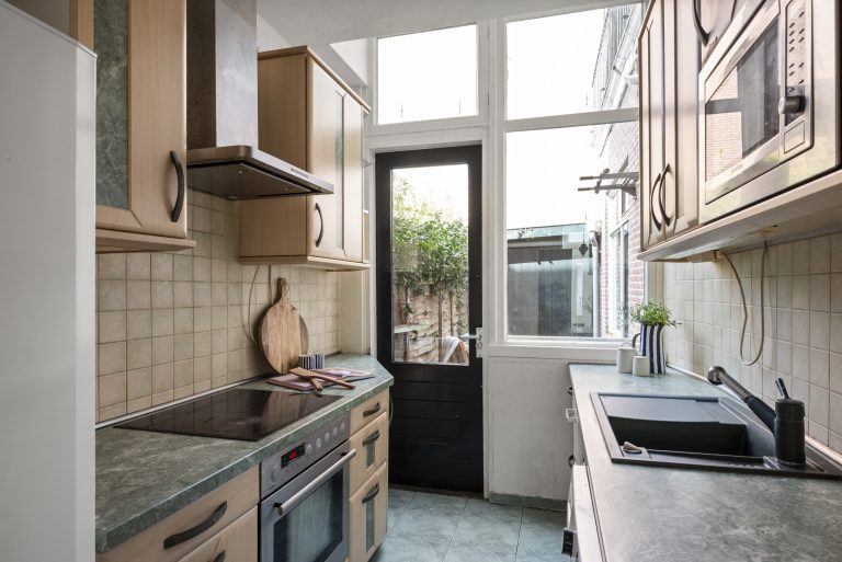 Ook de separate, eenvoudige keuken ligt aan de tuinzijde en heeft een deur naar buiten, wat het binnen-buiten gevoel extra versterkt. De woning beschikt daarnaast over een kelder van circa 10 m², handig voor opslag, en een compacte badkamer met douche en toilet. Alles is functioneel en biedt een fijne basis om het helemaal naar je eigen smaak te maken.