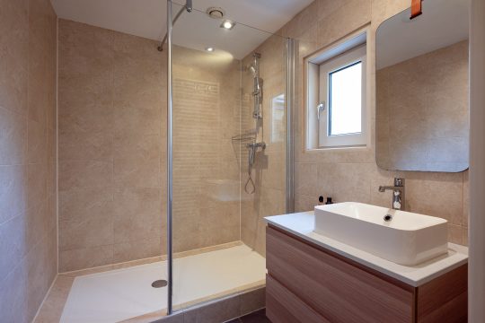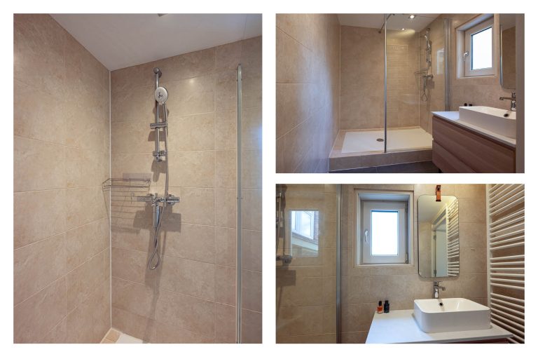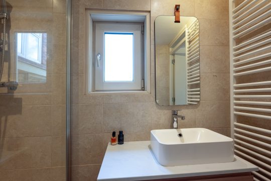 * Badkamer met inloopdouche en wastafelmeubel en raam voor natuurlijke ventilatie