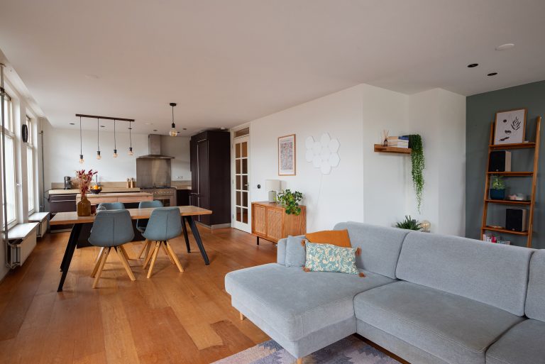 Binnen stroomt het licht van alle kanten naar binnen. De hoekligging geeft de woonkamer iets luchtigs — vijf ramen en openslaande deuren zorgen voor een constant spel van daglicht en groen uitzicht. De ruimte is groot genoeg voor bijvoorbeeld een lange tafel voor etentjes, een comfortabele zithoek bij het raam en een fijne werkplek. De open keuken nodigt uit tot koken, praten, borrelen. Alles klopt, van het natuurstenen blad tot het fornuis waar elke maaltijd een feestje kan worden.