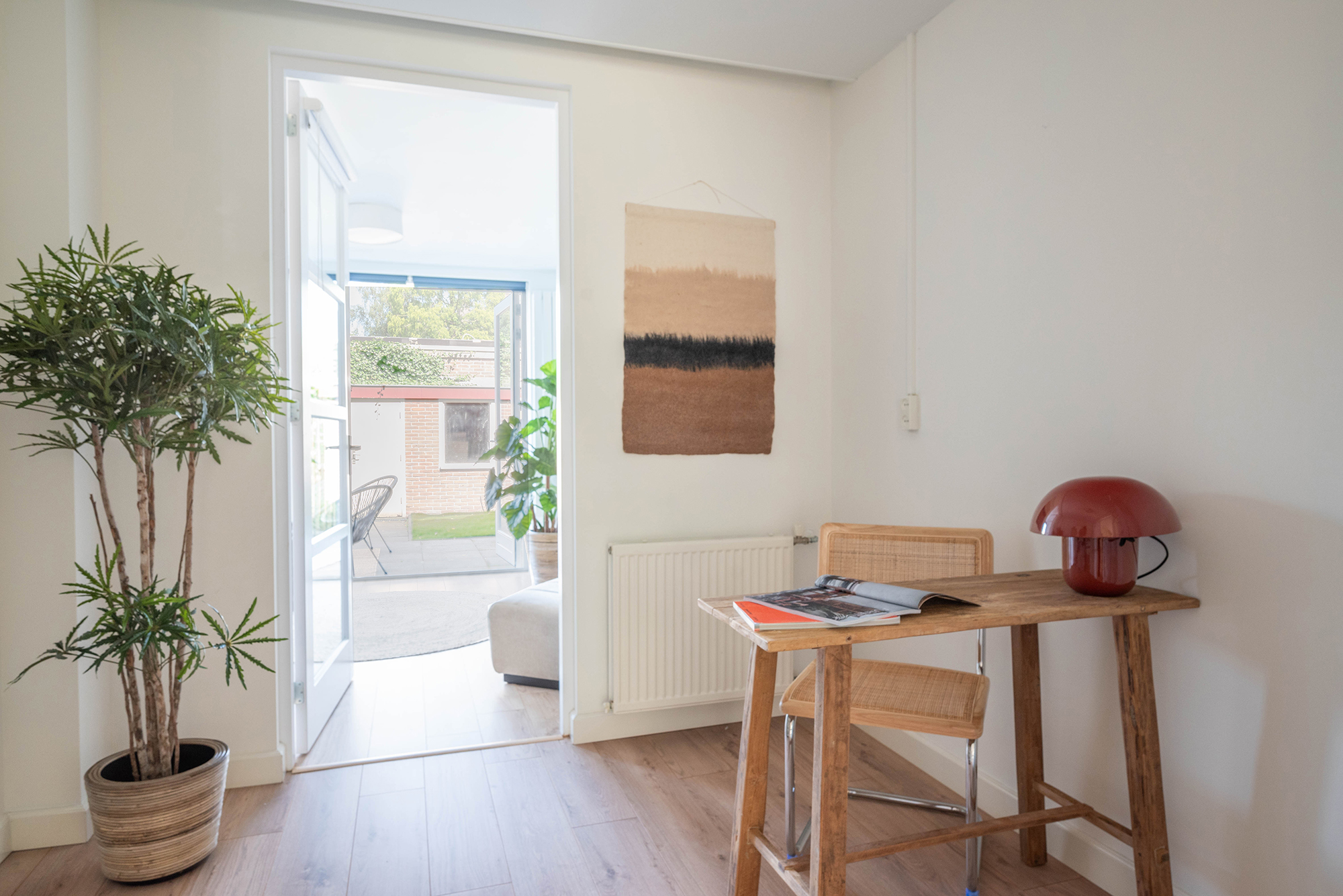 De ruime slaapkamer in de uitbouw heeft openslaande deuren naar de zonnige tuin van 40 m². Tussen de woonkamer en de slaapkamer ligt nog een extra kamer, perfect als thuiskantoor of walk-in closet. Achter in de tuin bevindt zich een grote stenen berging met elektriciteitsaansluiting, ideaal voor je fietsen, tuinmeubelen en eventueel een extra koelkast of elektrische fiets.