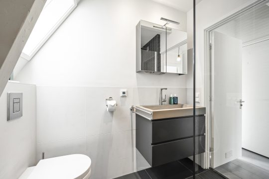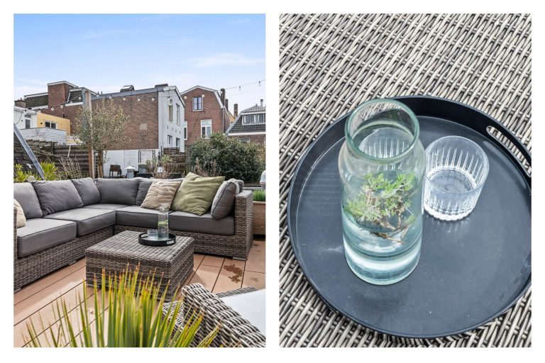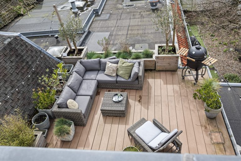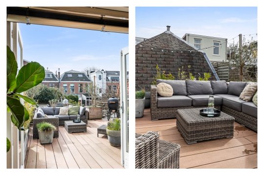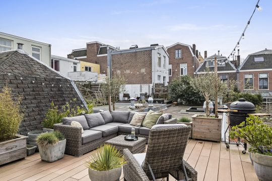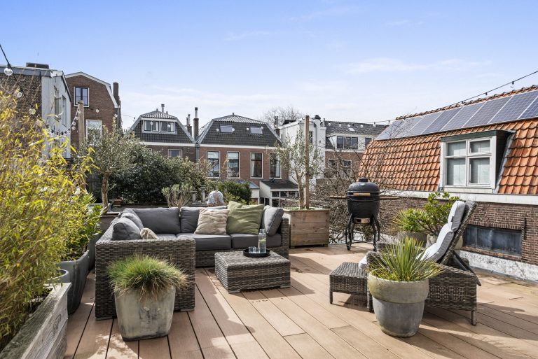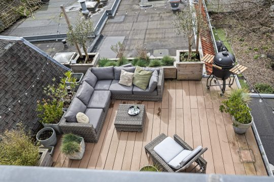 Via de openslaande deuren stap je vervolgens naar buiten, en daar wacht een verrassend ruim dakterras. Met meer dan 30 m² aan zonovergoten buitenruimte is dit een zeldzaamheid midden in de stad. Hier geniet je van optimale privacy, de hele dag zon en alle ruimte om te loungen, dineren of simpelweg te ontspannen. Een plek waar het elke dag voelt alsof je op vakantie bent.