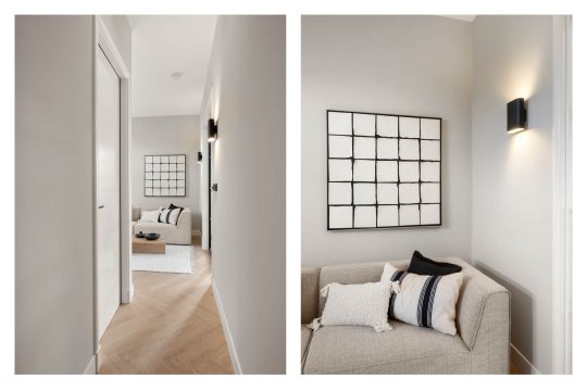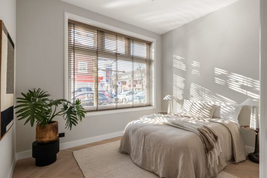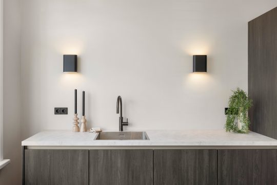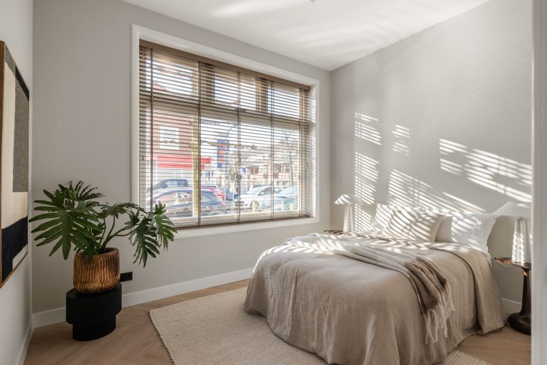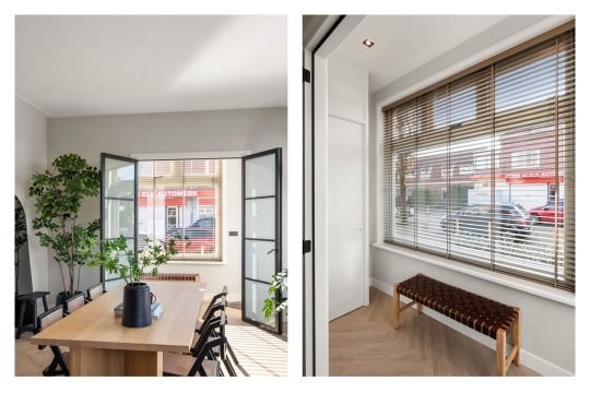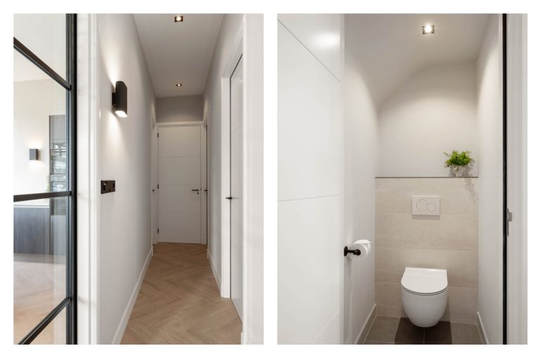 Binnen valt direct de rust en ruimtelijkheid op. De hoge plafonds van maar liefst 3,10 meter, de vele ramen en de drempelloze visgraat PVC-vloer met vloerverwarming geven de woning een open en hoogwaardige uitstraling. Alles is tot in detail afgewerkt: hoge plinten, luxe schakelmateriaal, stijlvolle inbouw- en wandspots en strak gestucte muren in een warme, neutrale zandkleur. Houten jaloezieën zorgen voor sfeer en privacy.