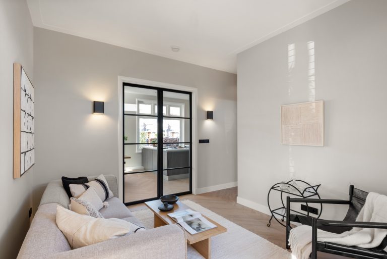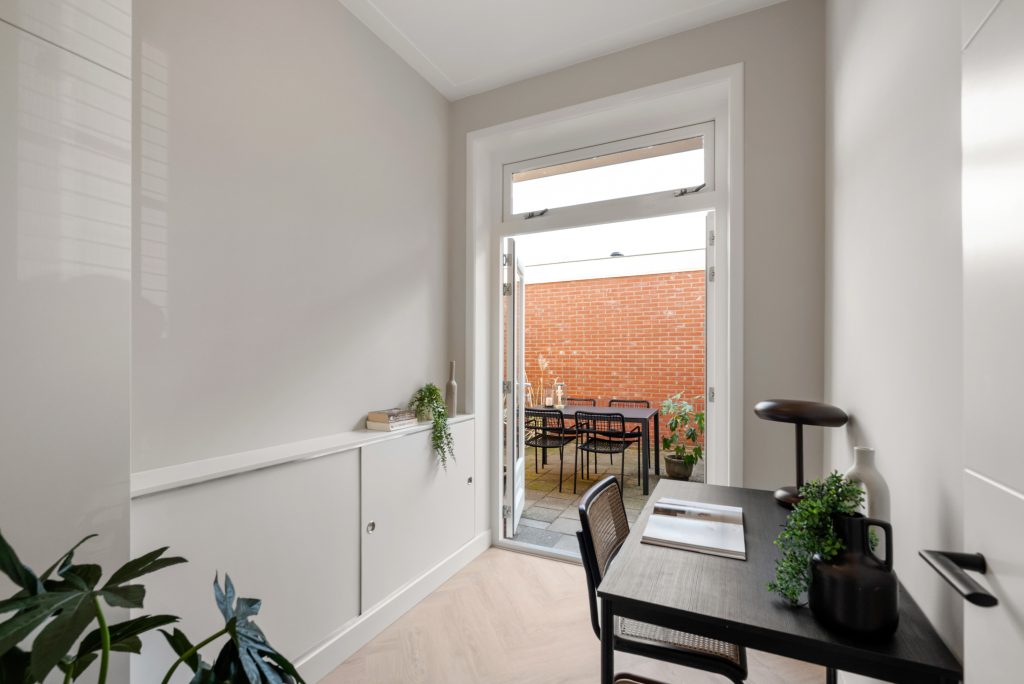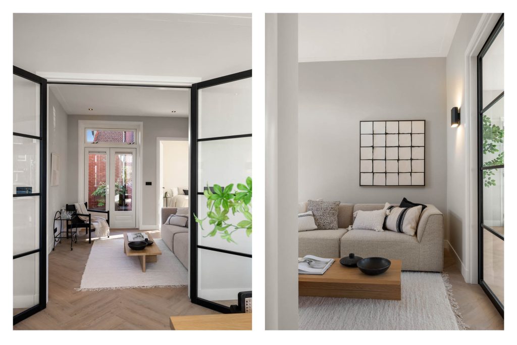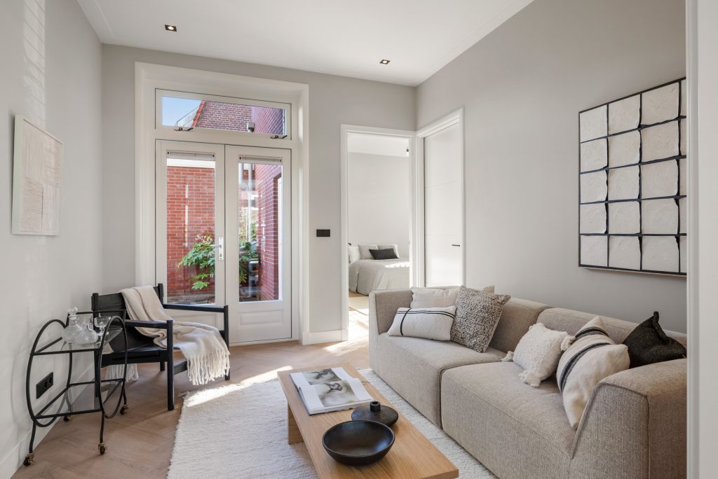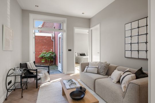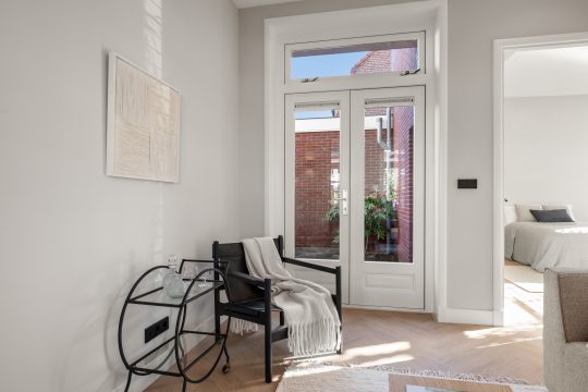 Via dubbele glazen deuren bereik je de sfeervolle zitkamer, een heerlijke plek om je terug te trekken met uitzicht op de binnentuin. Dankzij de openslaande deuren lopen binnen en buiten hier naadloos in elkaar over. De binnentuin is volledig privé en beschut: een zeldzame luxe en een perfecte plek voor een rustig moment in de zon.