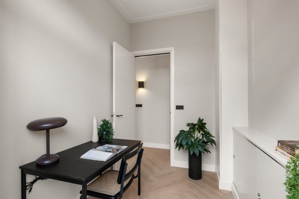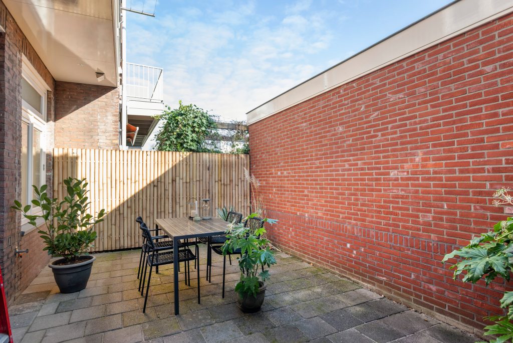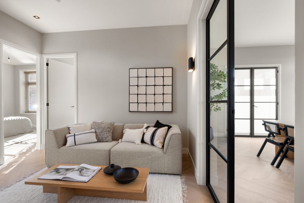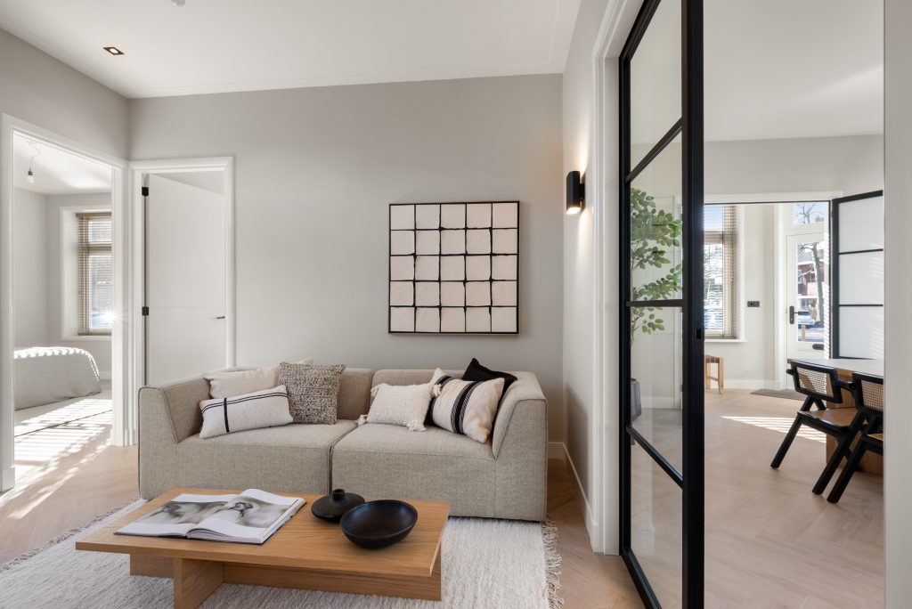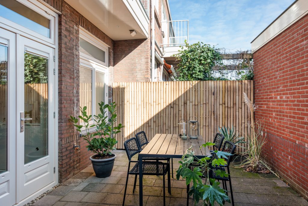 Via dubbele glazen deuren bereik je de sfeervolle zitkamer, een heerlijke plek om je terug te trekken met uitzicht op de binnentuin. Dankzij de openslaande deuren lopen binnen en buiten hier naadloos in elkaar over. De binnentuin is volledig privé en beschut: een zeldzame luxe en een perfecte plek voor een rustig moment in de zon.