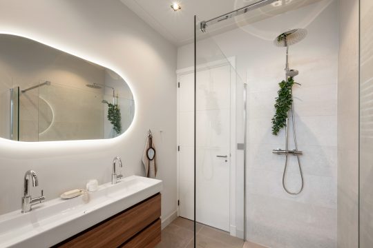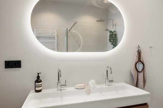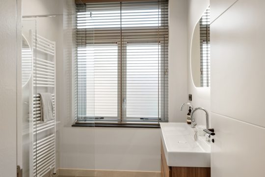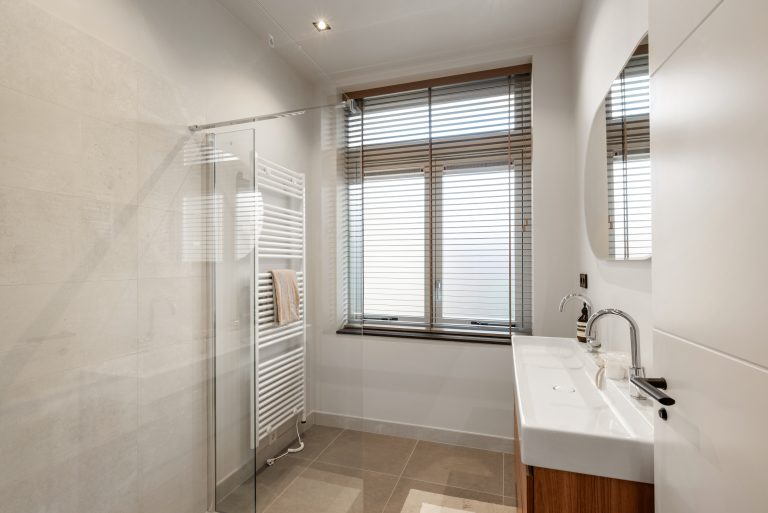 De badkamer is uitgevoerd in zachte natureltinten en voelt als een privé wellness. Je beschikt hier over een ruime inloopdouche met regen- en handdouche, een stijlvol wastafelmeubel met dubbele kraan, een luxe spiegel met verwarming en verlichting en een designradiator. Tijdloos, modern en strak afgewerkt.