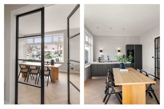 De woon- en eetkamer worden van elkaar gescheiden door elegante, kamerhoge glazen deuren. Zo blijft het gevoel van ruimte behouden, terwijl er duidelijke leefzones ontstaan.