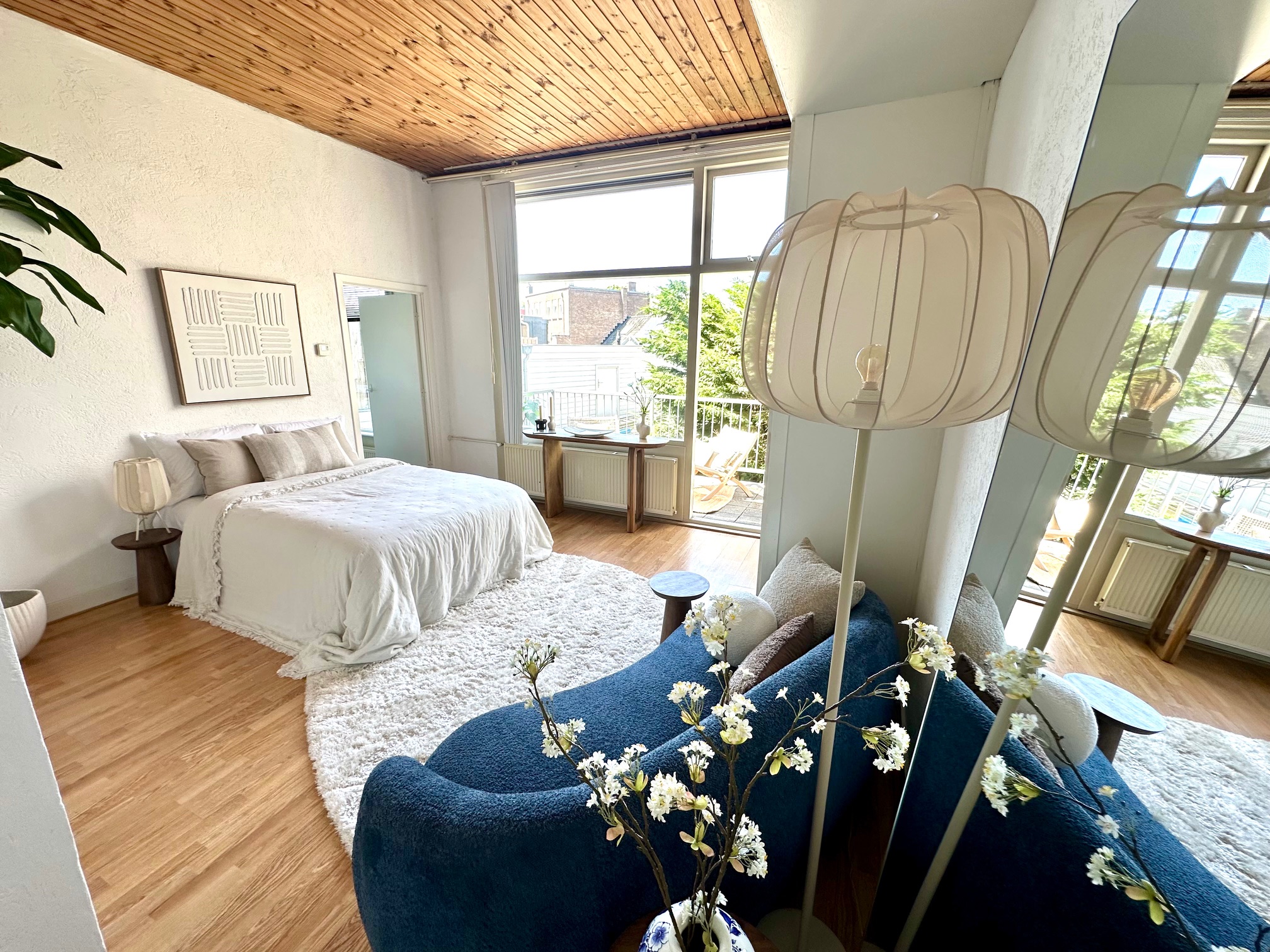 Je komt binnen in de woon-/slaapkamer, een lichte ruimte met een grote vaste kast – ideaal voor al je spullen. Vanuit hier stap je zo het royale balkon op het westen op. Een fijne plek waar je tot in de avond van de zon kunt genieten.