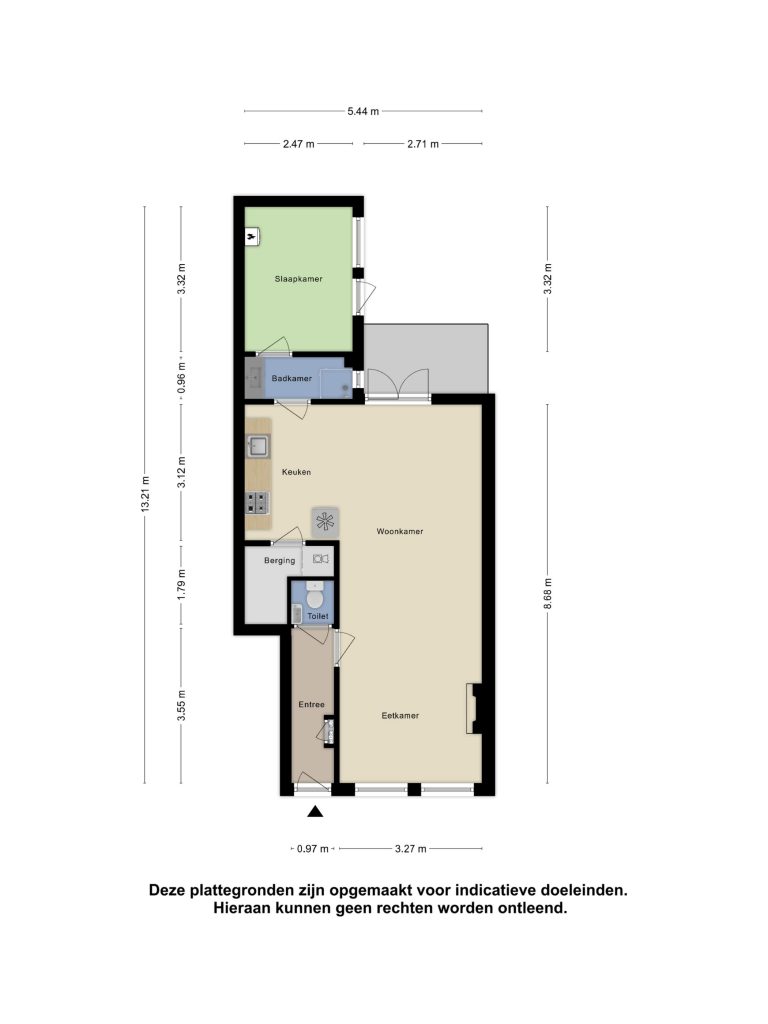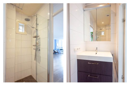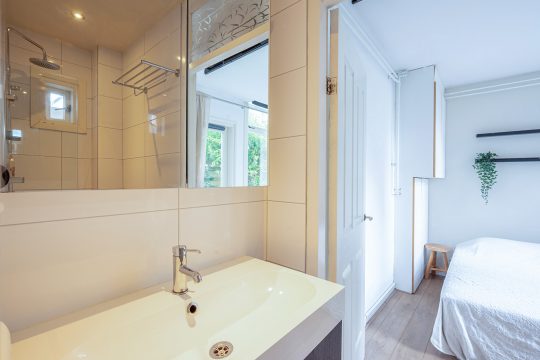 Binnen is de indeling praktisch en comfortabel. Vanuit de hal bereik je de woonkamer, met de open keuken aan de achterzijde. Handig is de inpandige berging die grenst aan de keuken, ideaal voor voorraad en de wasmachine. De badkamer is modern en fris en is voorzien van een ruime douche en een wastafelmeubel. Achterin vind je de slaapkamer, die net als de woonkamer direct toegang biedt tot de tuin. Alles voelt verzorgd en klaar om bewoond te worden.