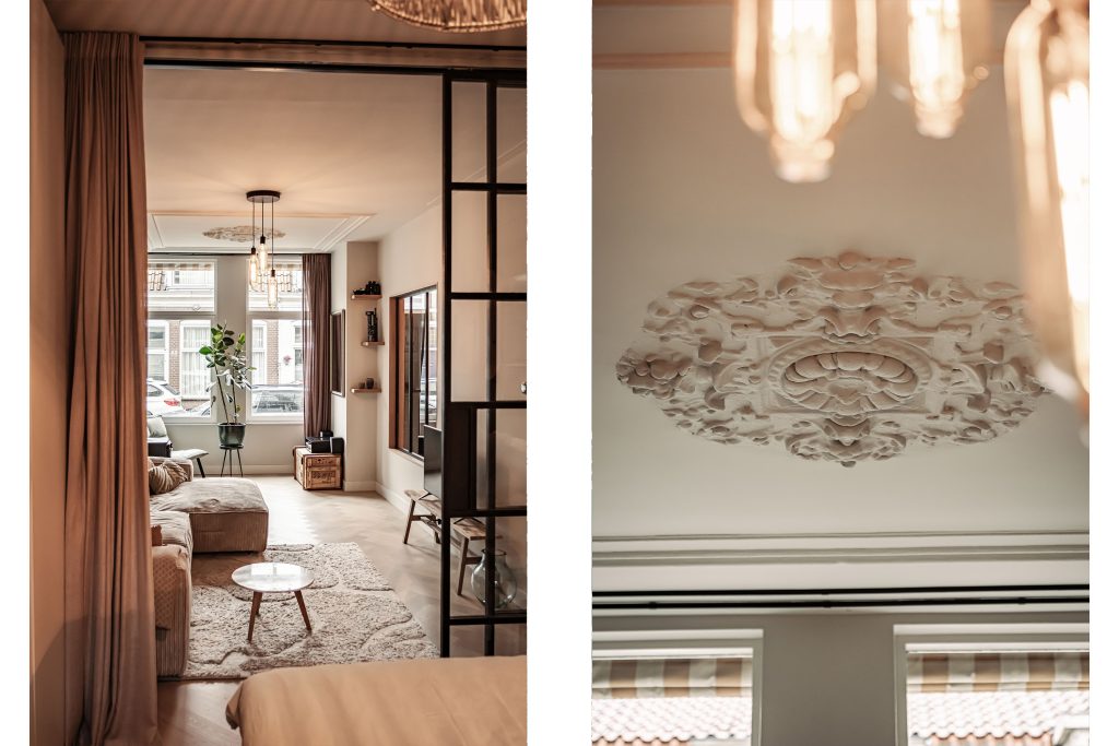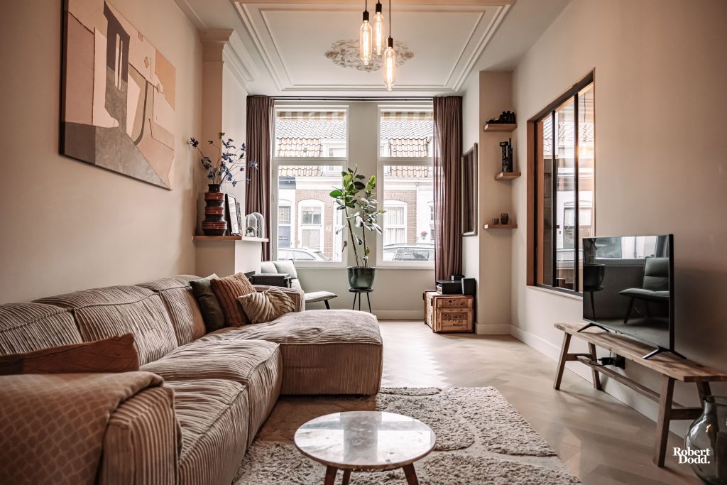 De houten visgraatvloer brengt warmte en luxe door vrijwel de hele woning en leidt je naar de woonkamer, waar de hoogte en het ornamentenplafond direct indruk maken.