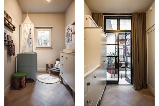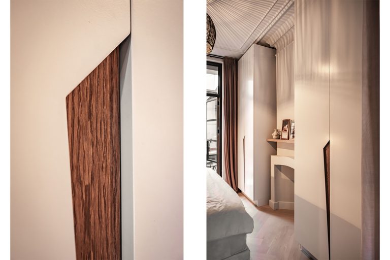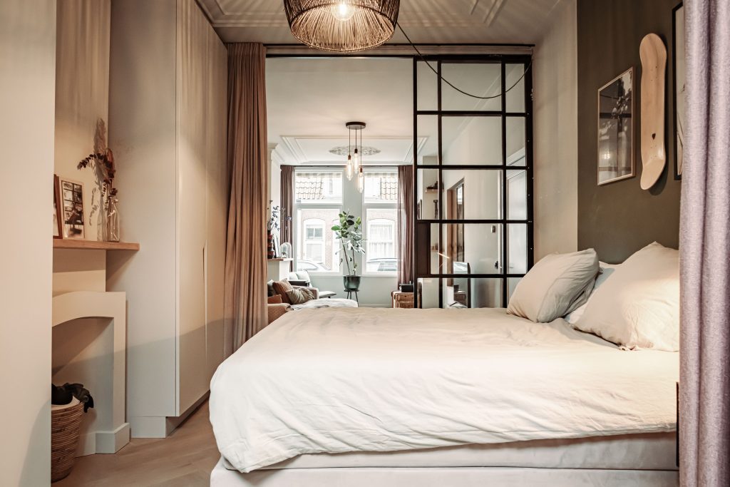 De kamerhoge stalen deuren geven een stoer contrast en brengen je naar de eerste slaapkamer, waar maatwerk kasten zorgen voor een strakke, rustige uitstraling.