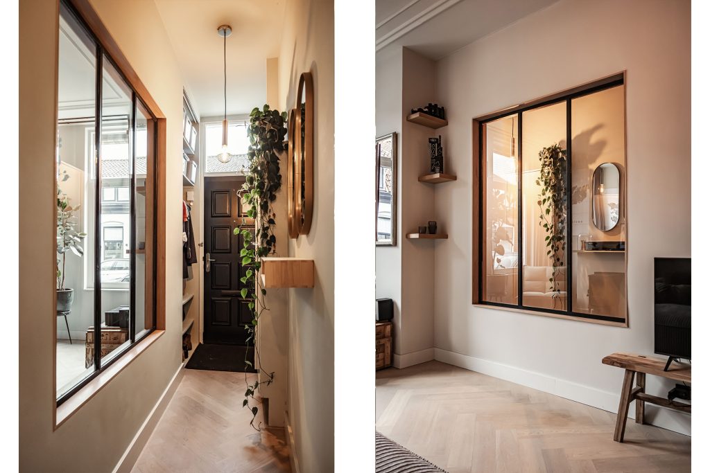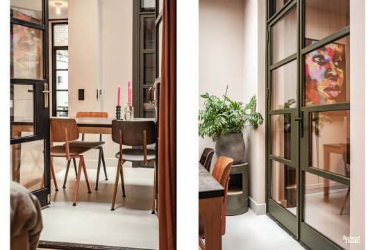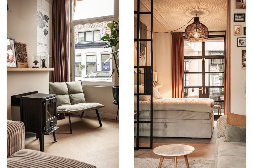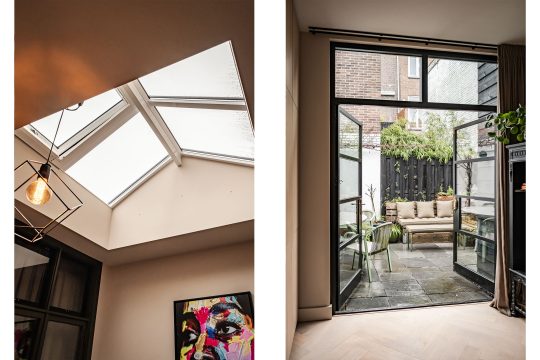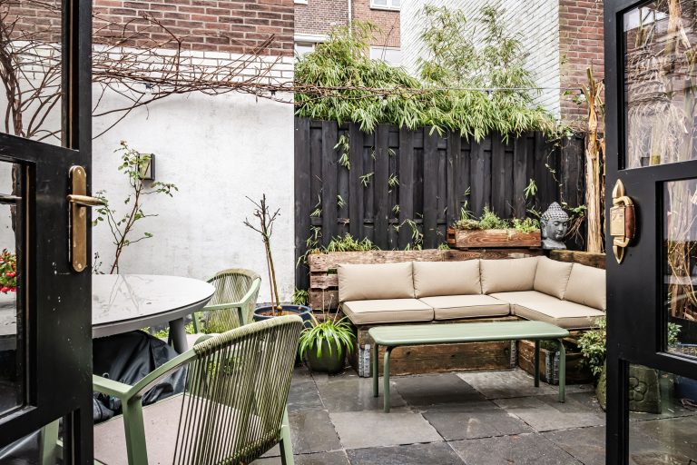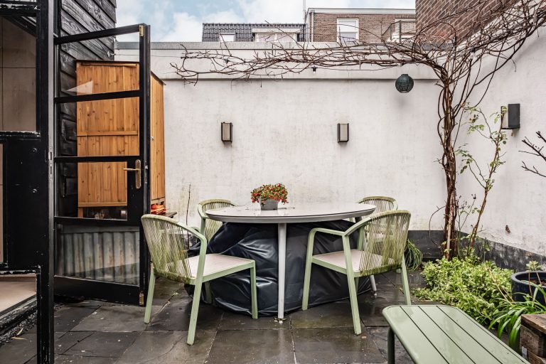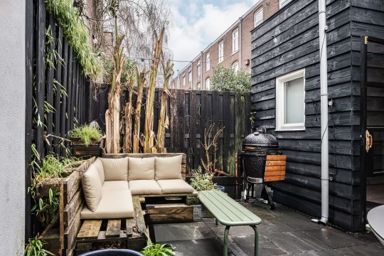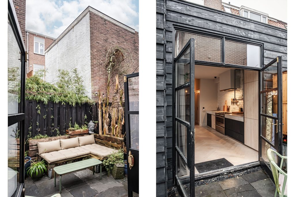 En dan is er nog de tuin… een plek waar de sfeer van binnen moeiteloos doorloopt naar buiten. Achter de openslaande deuren, met handgrepen gemaakt van oude bagagetrolleys van Swiss Air, stap je je eigen stadstuin in. Met buitenverlichting, warmte en karakter is dit een plek waar je heerlijk en in alle rust kunt ontspannen.