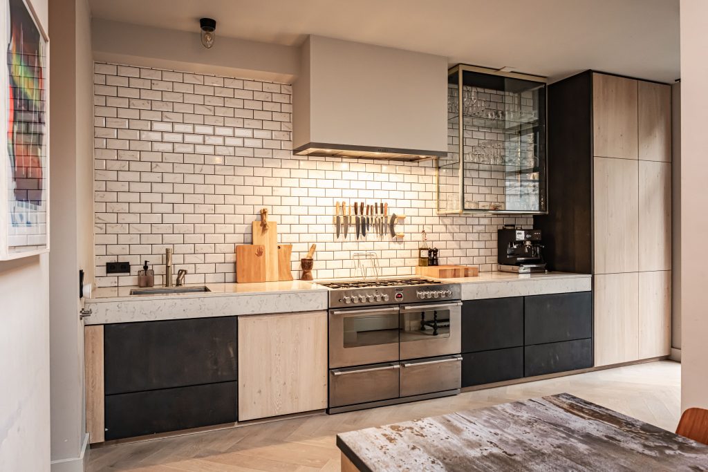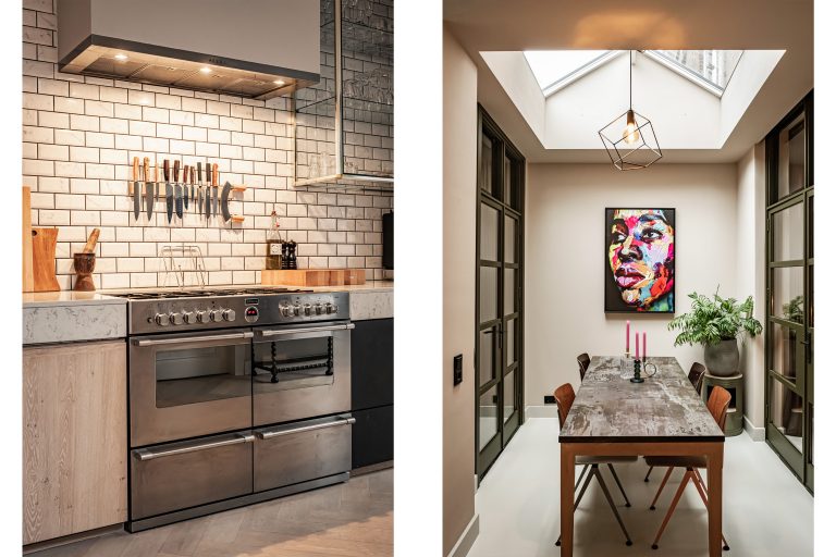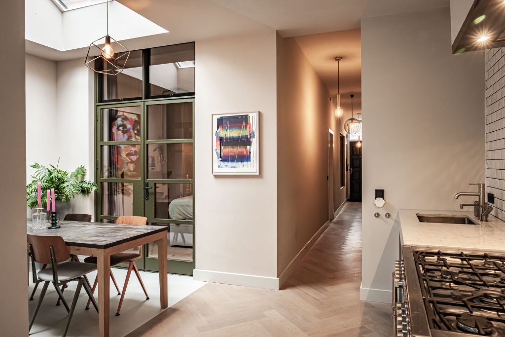 Het hart van de woning vind je aan de achterzijde, in de flinke uitbouw die vanaf 2016 is gerealiseerd. Hier ligt de woonkeuken, en die is werkelijk van een ander niveau. Op maat gebouwd, vol karakter en met een composiet marmeren aanrechtblad dat niet alleen prachtig oogt, maar ook nog eens een bijzonder verhaal heeft: dit blad deed eerder dienst in de keuken van een bekende Nederlandse chef-kok. Je kookt hier alsof je in je eigen privé-bistro staat, met een vrijstaand fornuis met twee ovens en zeven gaspitten, een Quooker, een afzuigkap en een koelkast met vriezer. De voormalige patio is slim bij de keuken getrokken, waardoor er ruimte is ontstaan voor een grote eethoek waar je moeiteloos lange avonden met vrienden doorbrengt. Het daglicht valt zacht naar binnen via de dakkoepel en geeft de ruimte precies die lichte, ontspannen sfeer die je zoekt.