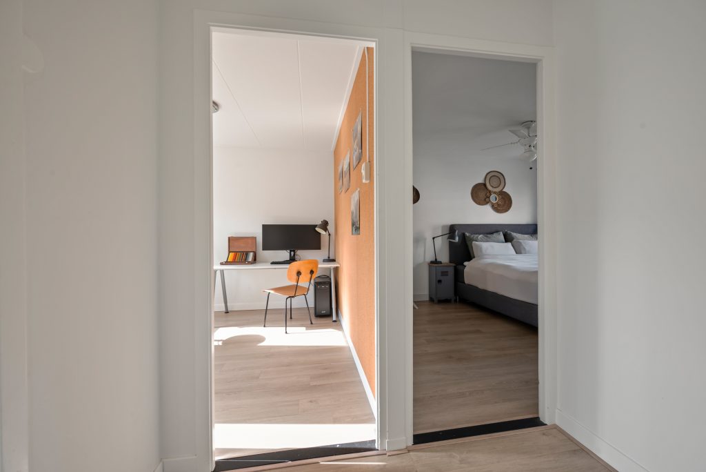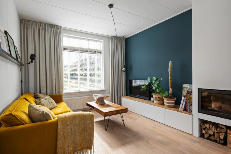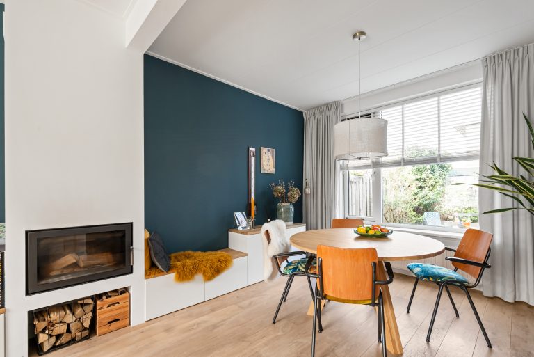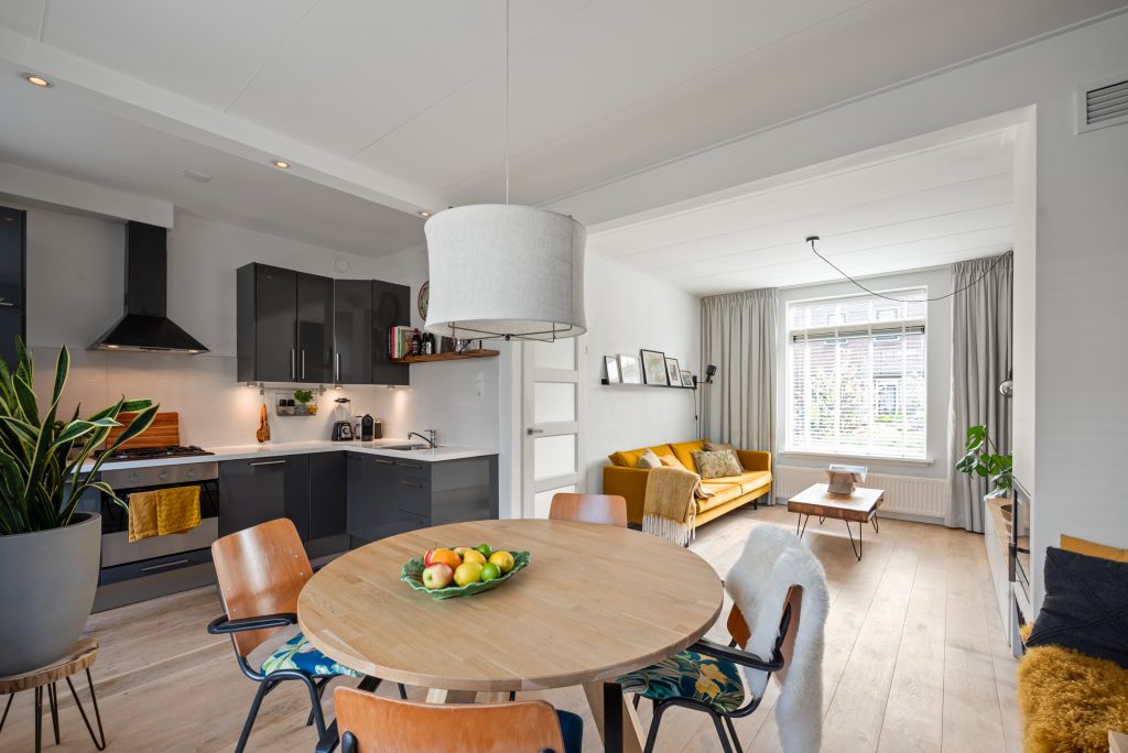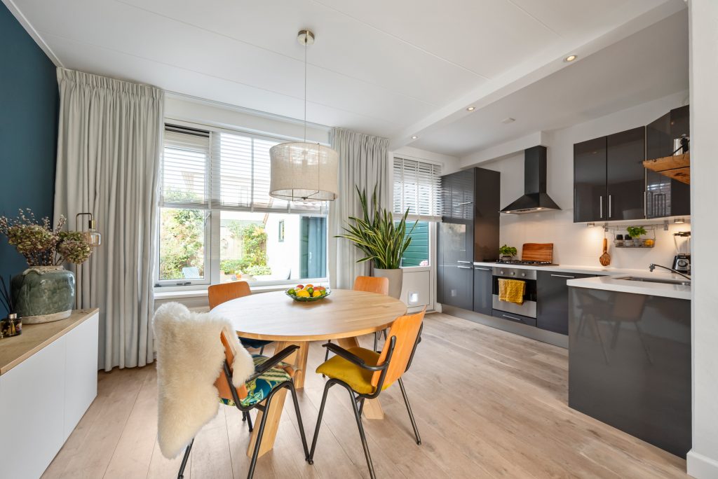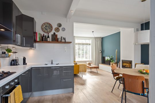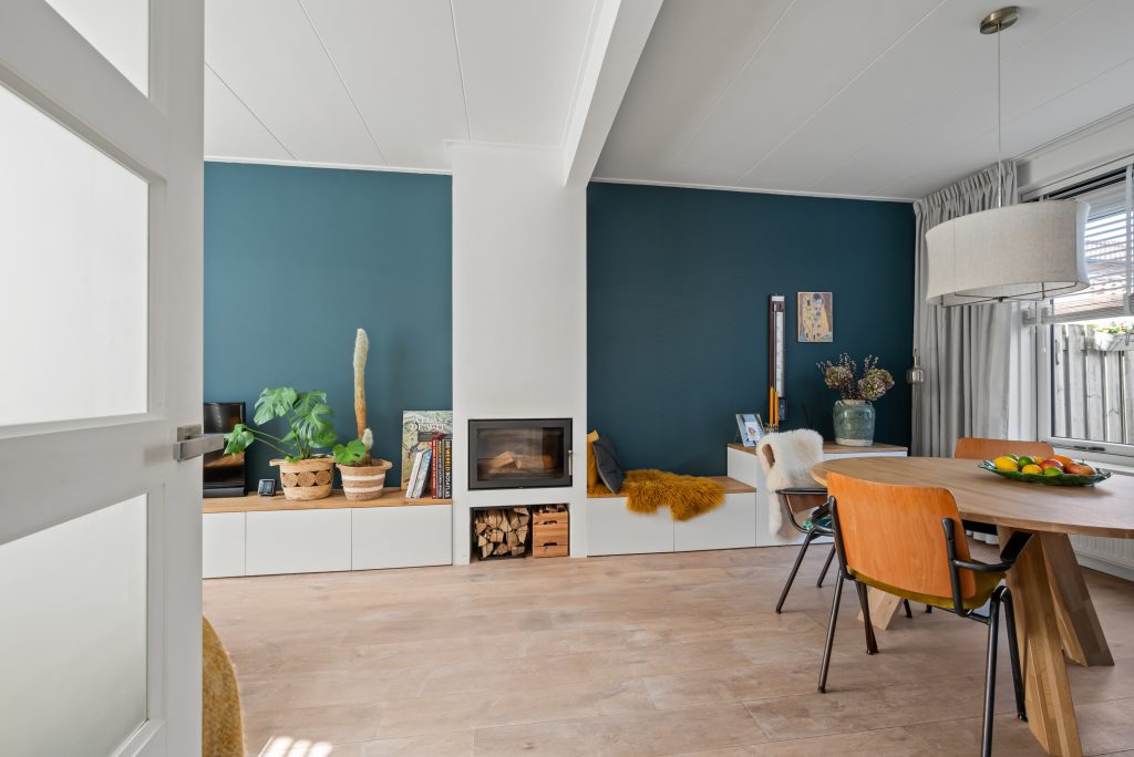 Binnen word je verwelkomd in een lichte, doorzon woonkamer waar het daglicht vrij spel heeft. De houtkachel zorgt voor extra sfeer en warmte op de koudere dagen, waardoor dit echt het hart van het huis wordt. De open keuken sluit hier naadloos op aan en is ingericht in een praktische L-opstelling, voorzien van alle benodigde inbouwapparatuur. Vanuit de keuken stap je zo de achtertuin in. Hier heb je verschillende hoekjes waar je lekker kunt zitten.