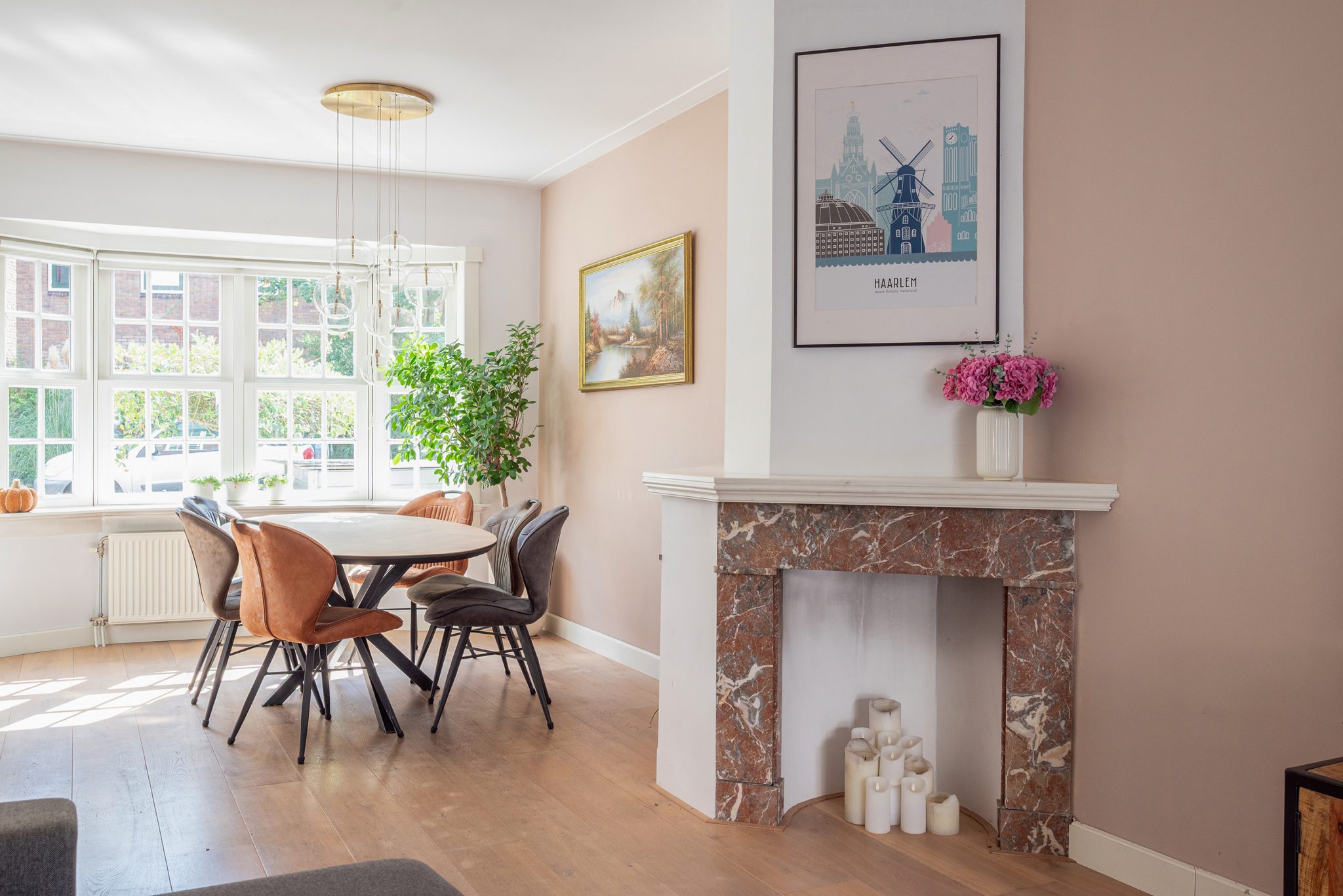 Je komt binnen via de voortuin en loopt de vestibule door met glas-in-lood bovenlicht. Een fijne binnenkomst die meteen de toon zet. Achter de paneeldeur gaat de woonkamer schuil: een erker, een warm houten vloer, twee marmeren schouwen die de ruimte extra cachet geven en natuurlijk openslaande deuren naar de tuin. Zodra ze openstaan, loopt binnen en buiten naadloos in elkaar over. De achtertuin verrast: doordat het huis aan de achterkant in een hoek loopt, is de tuin breder dan je zou verwachten. Je hebt er ruimte genoeg voor een lange eettafel, een loungehoek én groen, terwijl je op ieder moment van de dag wel een plekje in de zon vindt.