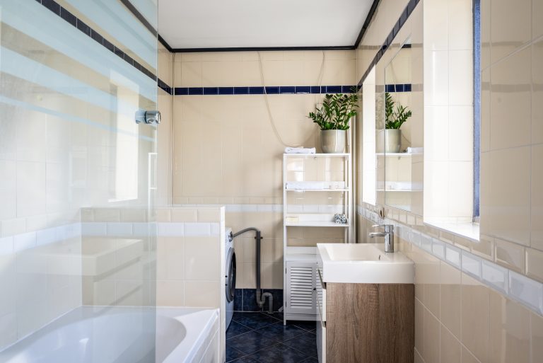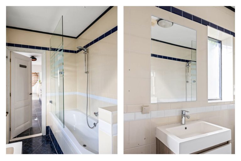De badkamer bevindt zich op de begane grond en is compleet ingericht met een bad, douche, wastafel en een aansluiting voor de wasmachine.