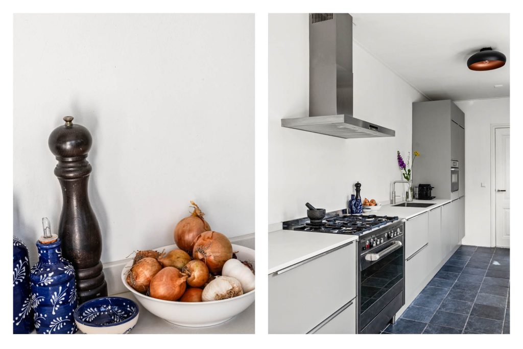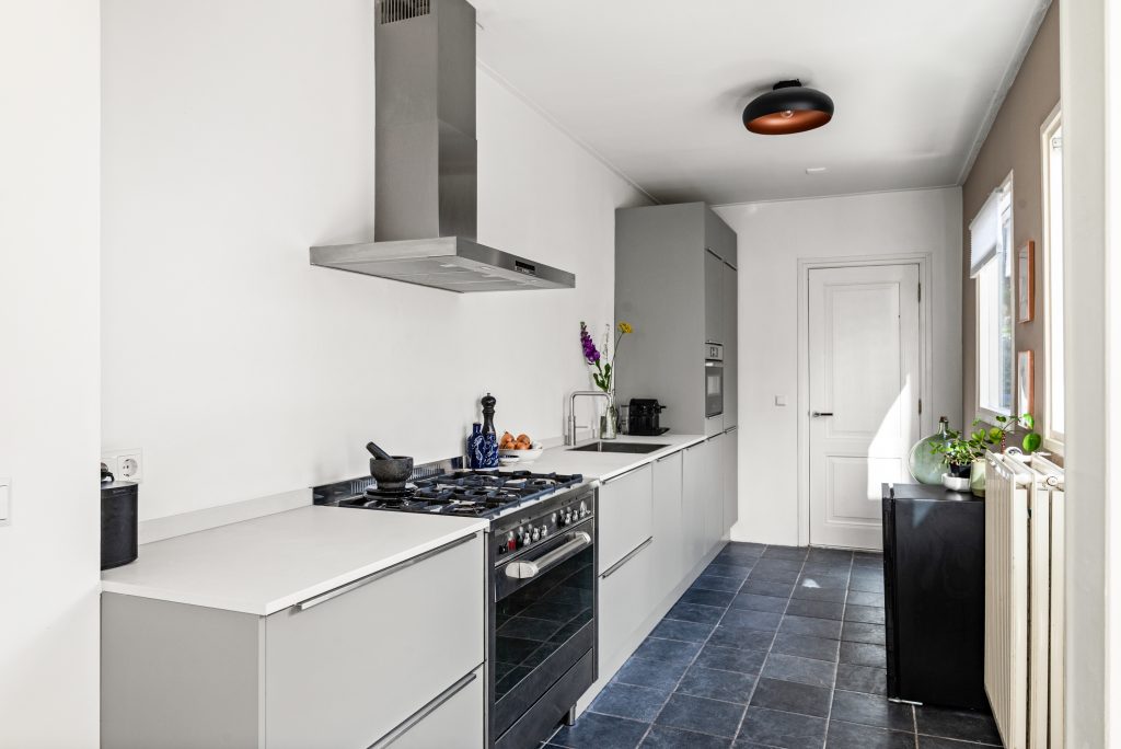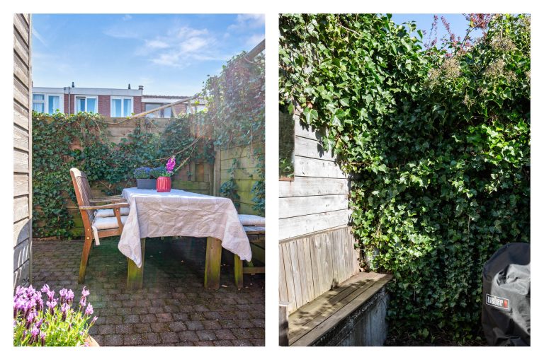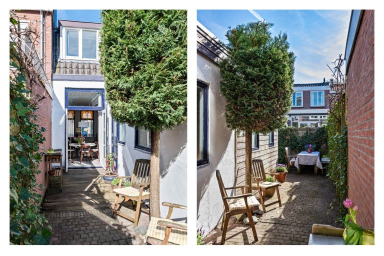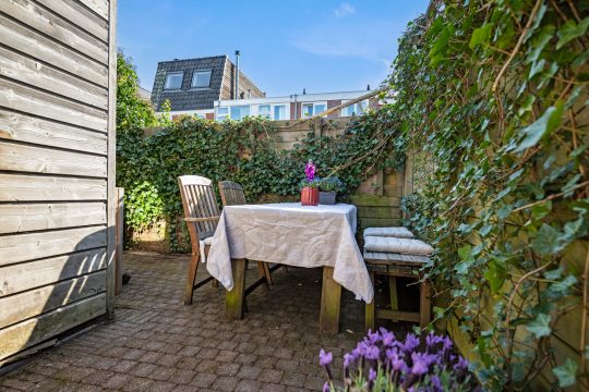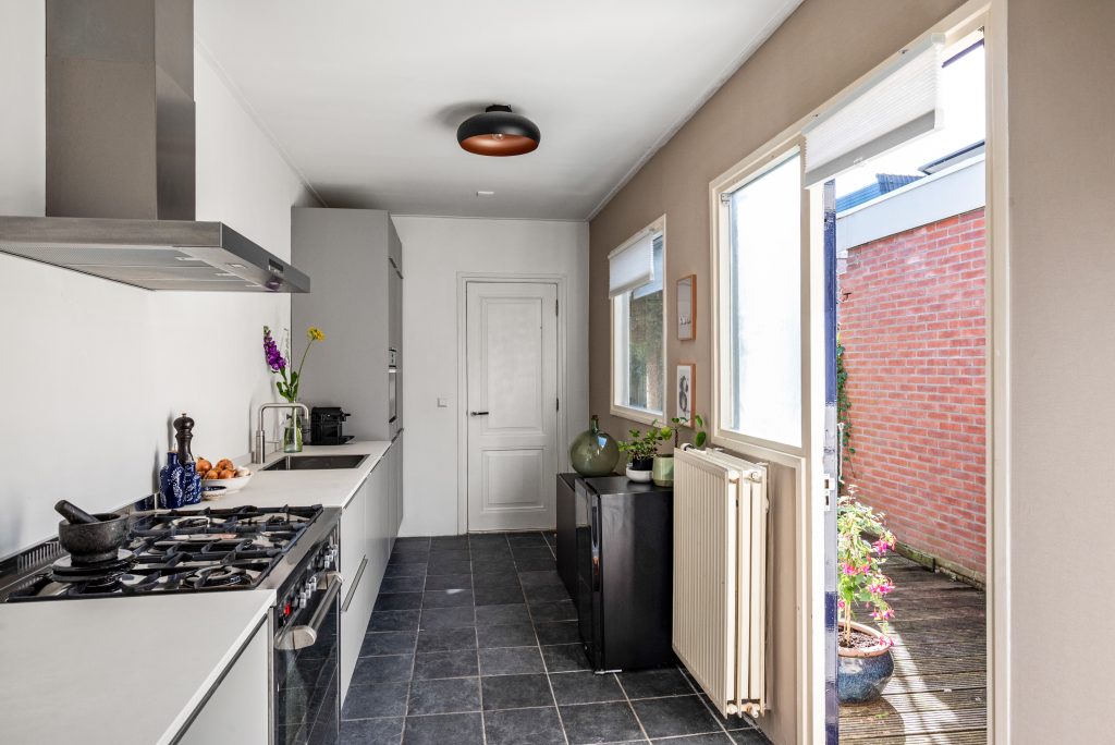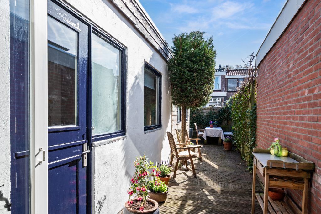 De keuken in de uitbouw is van 2021 en sluit perfect aan bij het geheel. Je kookt hier met plezier dankzij de complete inrichting met onder andere vijfpits gasfornuis, een Quooker, combi-oven, koel-vriescombinatie en vaatwasser. Via de deur in de keuken en de openslaande deuren in de woonkamer bereik je de achtertuin. Buiten geniet je van een verrassend zonnige tuin. Door de diepte van de tuin valt er volop licht naar binnen en kun je hier op ieder moment van de dag heerlijk zitten.