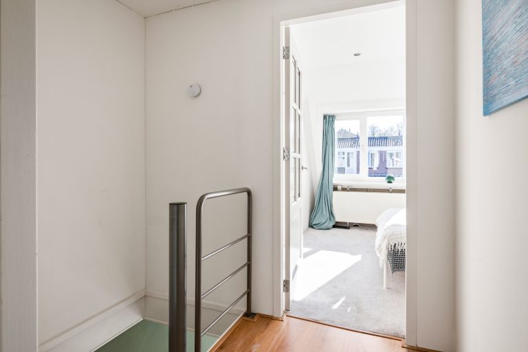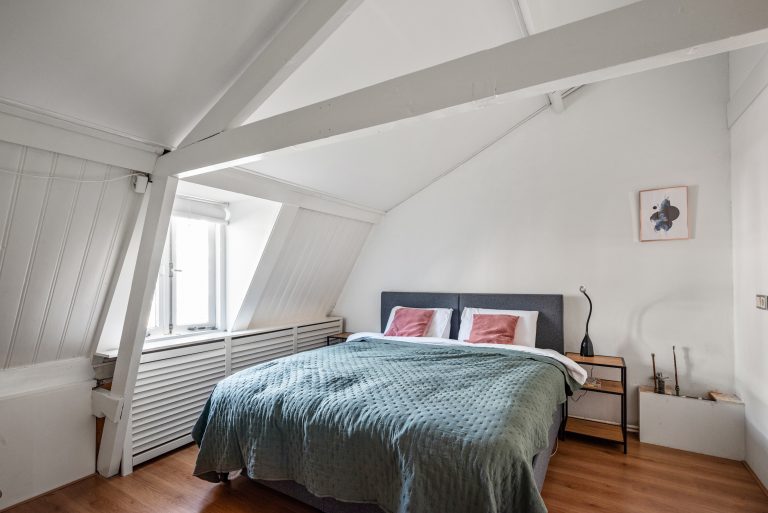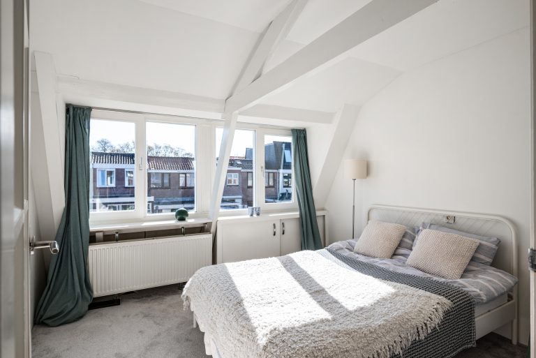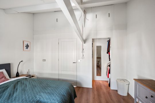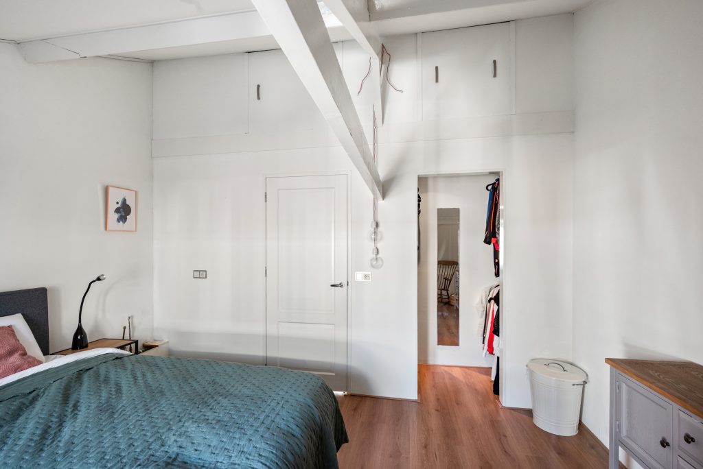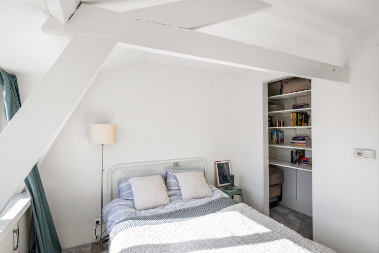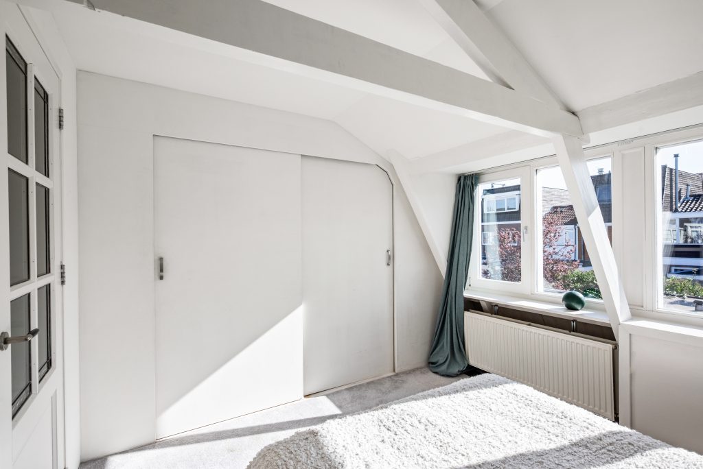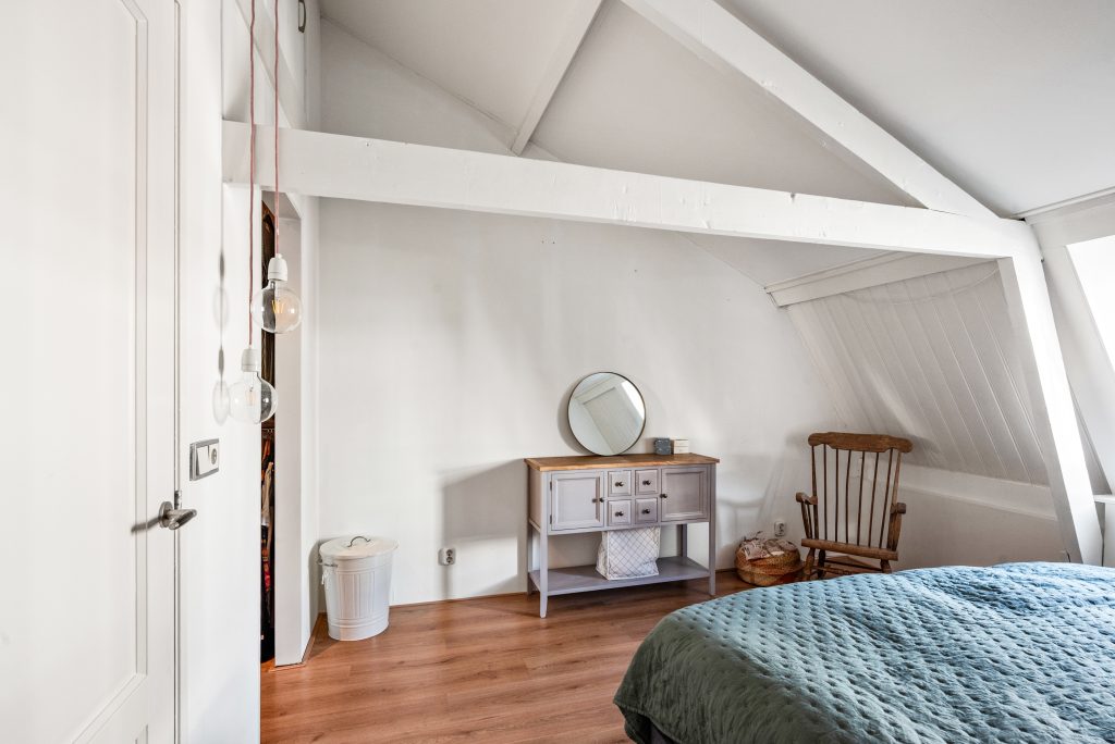 Op de eerste verdieping vind je twee slaapkamers die ieder hun eigen charme hebben. De balkenconstructies zijn zichtbaar en geven de ruimtes een warme, karaktervolle uitstraling. Aan de voorzijde beschik je over een kamer met een compacte inloopkast en een wastafelaansluiting, terwijl de slaapkamer aan de achterzijde is voorzien van een dakkapel en een ruime vaste kast, wat zorgt voor extra licht en bergruimte.