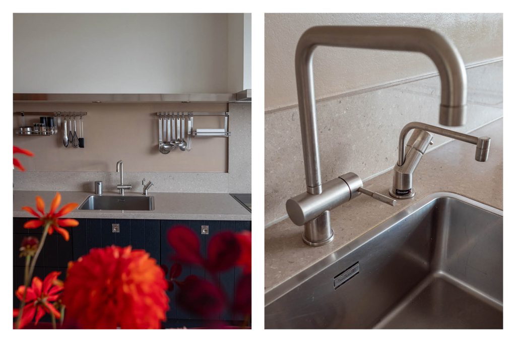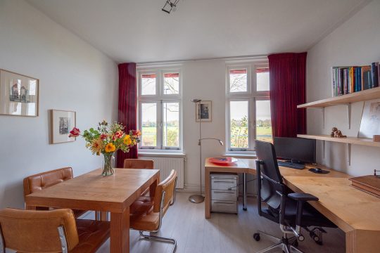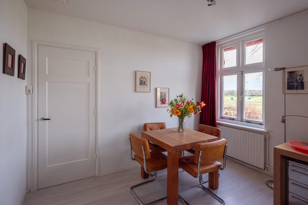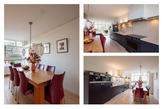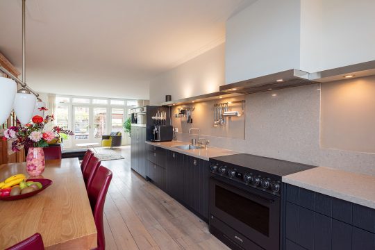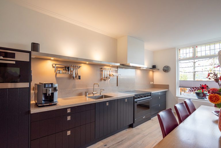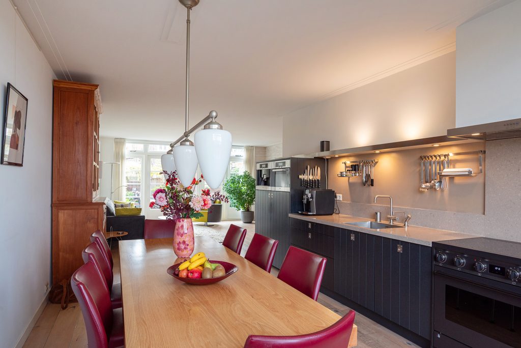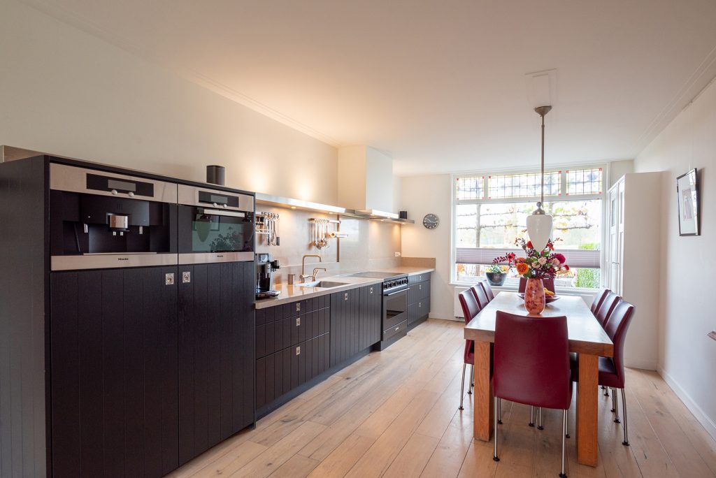 Aan de voorzijde ligt de moderne woonkeuken. De hoogwaardige apparatuur maakt het tot een genot om hier te koken: een Smeg-inductiefornuis, een AEG-vaatwasser, Siemens koelkast en vriezer en een combimagnetron. De Quooker zorgt voor direct kokend water en de originele servieskast geeft de ruimte een vleugje extra karakter.