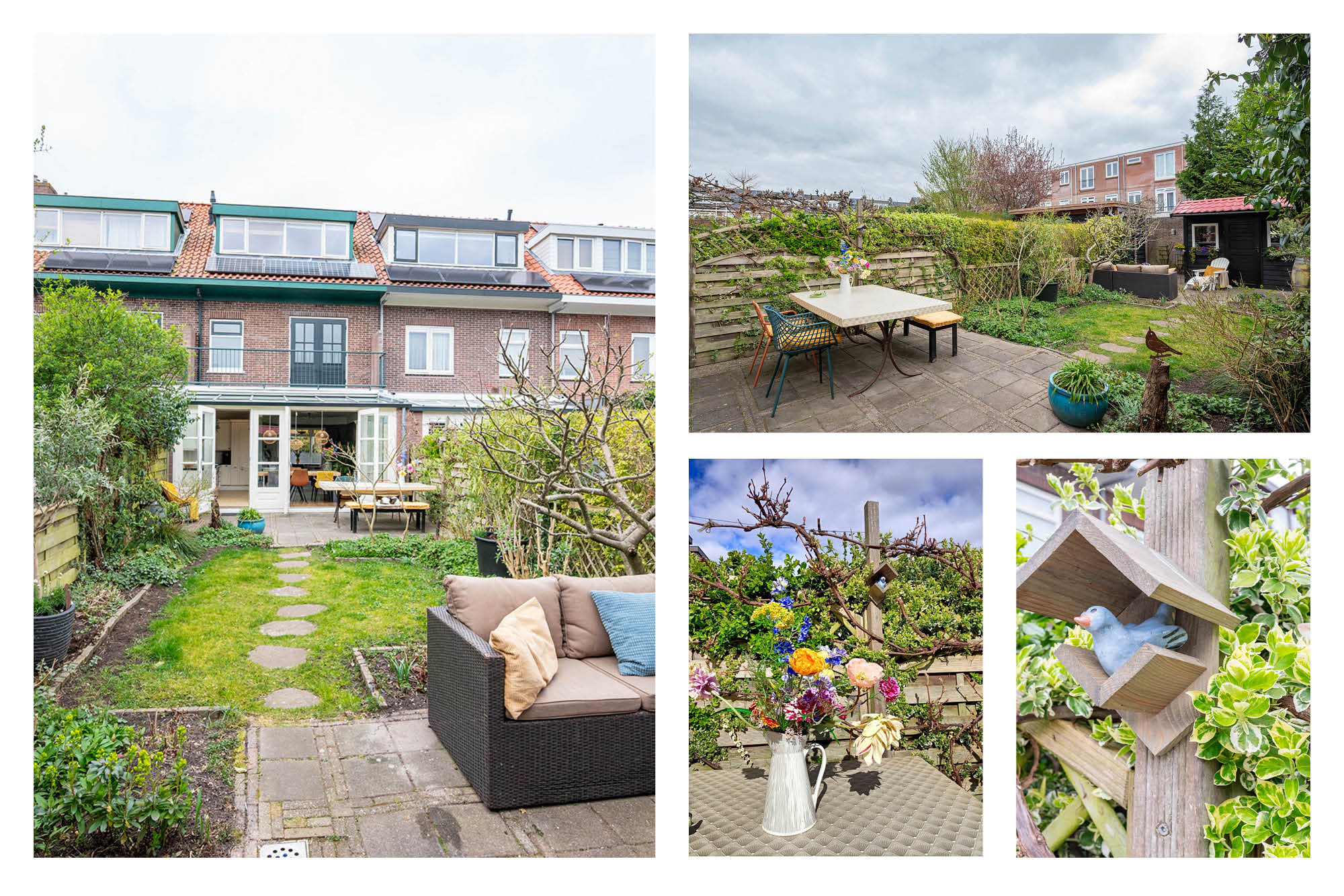 De openslaande deuren in jaren ’30 stijl brengen je naar de diepe achtertuin op het zuidoosten. Dankzij de diepte vind je hier op ieder moment van de dag een fijn plekje in de zon op een van de terrassen. De tuin, die binnenkort weer in volle bloei staat, nodigt uit tot ontspannen momenten. Het is de perfecte plek om in alle rust van de natuur te genieten, of om de kinderen buiten te laten spelen.