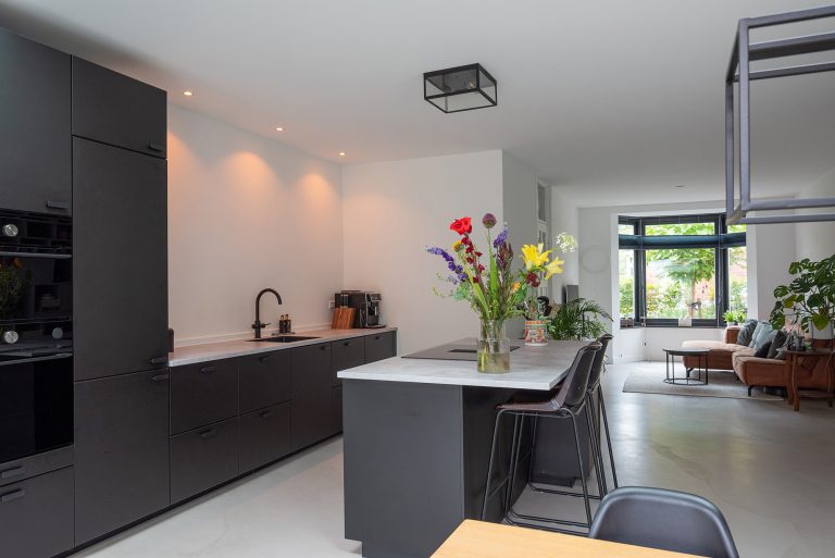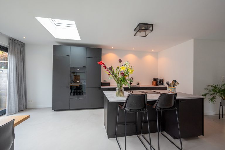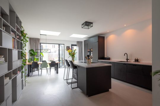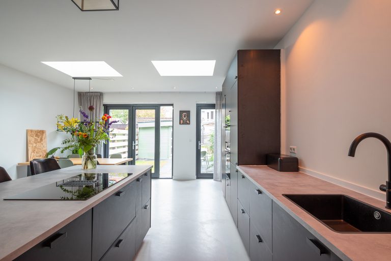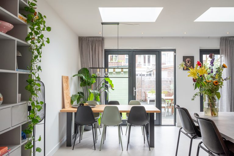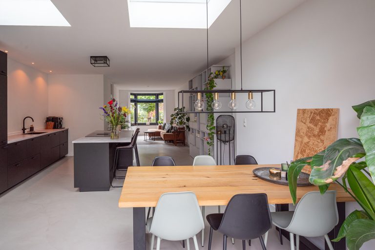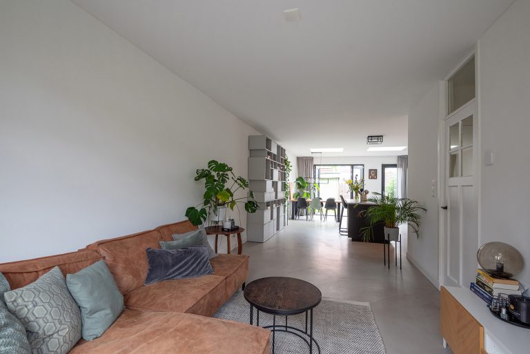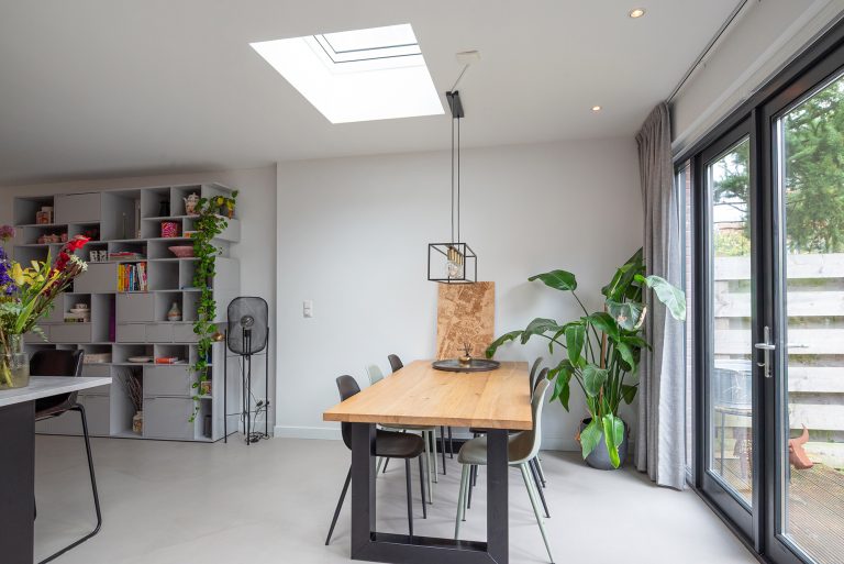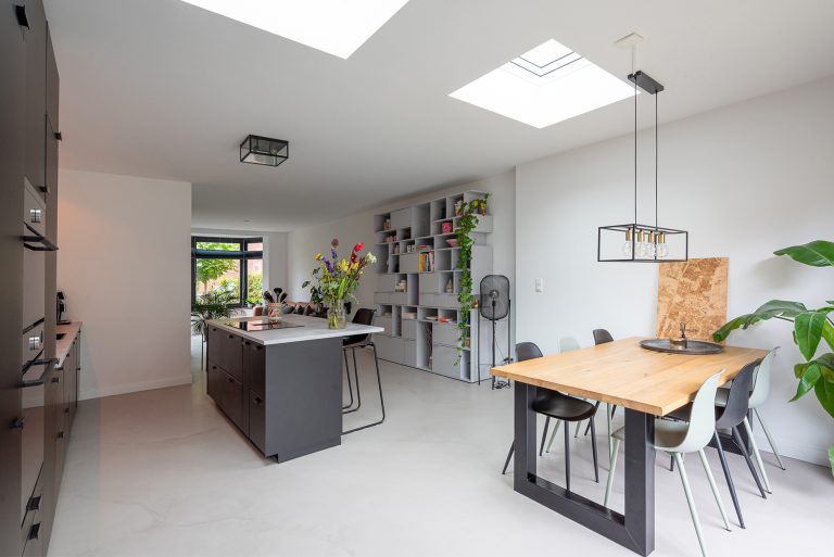 Binnen stroomt het licht je tegemoet. De gietvloer met vloerverwarming voelt prettig warm, de erker vangt de ochtendzon en aan de achterzijde loopt de uitbouw over in openslaande deuren naar de tuin. Twee grote lichtkoepels zorgen ervoor dat de ruimte altijd baadt in daglicht.