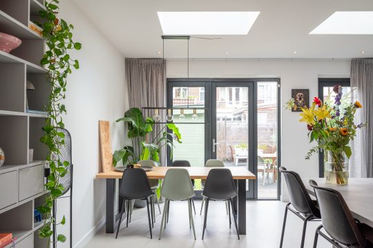 * Ruime uitbouw met openslaande deuren en lichtkoepels