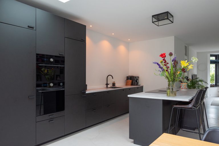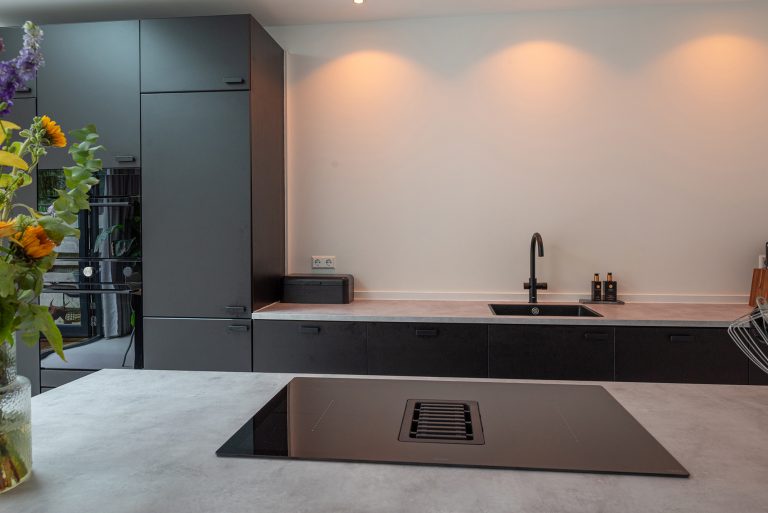 In de moderne open keuken is koken een feestje — het kookeiland met bar nodigt je gasten uit gezellig aan te schuiven terwijl je een heerlijke maaltijd voor ze bereid. Alles wat je kunt wensen is hier ingebouwd: een inductiekookplaat met geïntegreerde afzuiging, een stoomoven, combi-magnetron, koel-vriescombinatie, vaatwasser en een Grohe kokendwaterkraan.